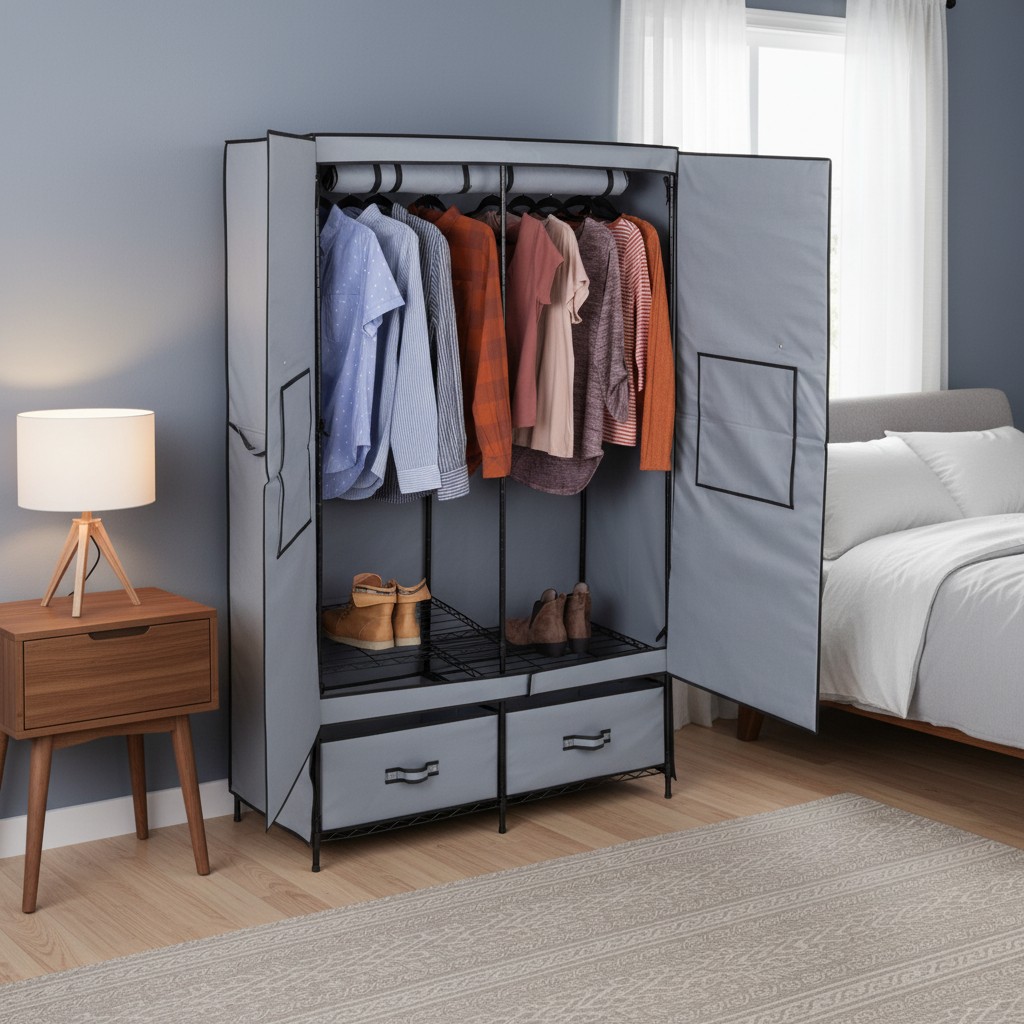 Gray 60-Inch Wide Double Door Portable Wardrobe Closet