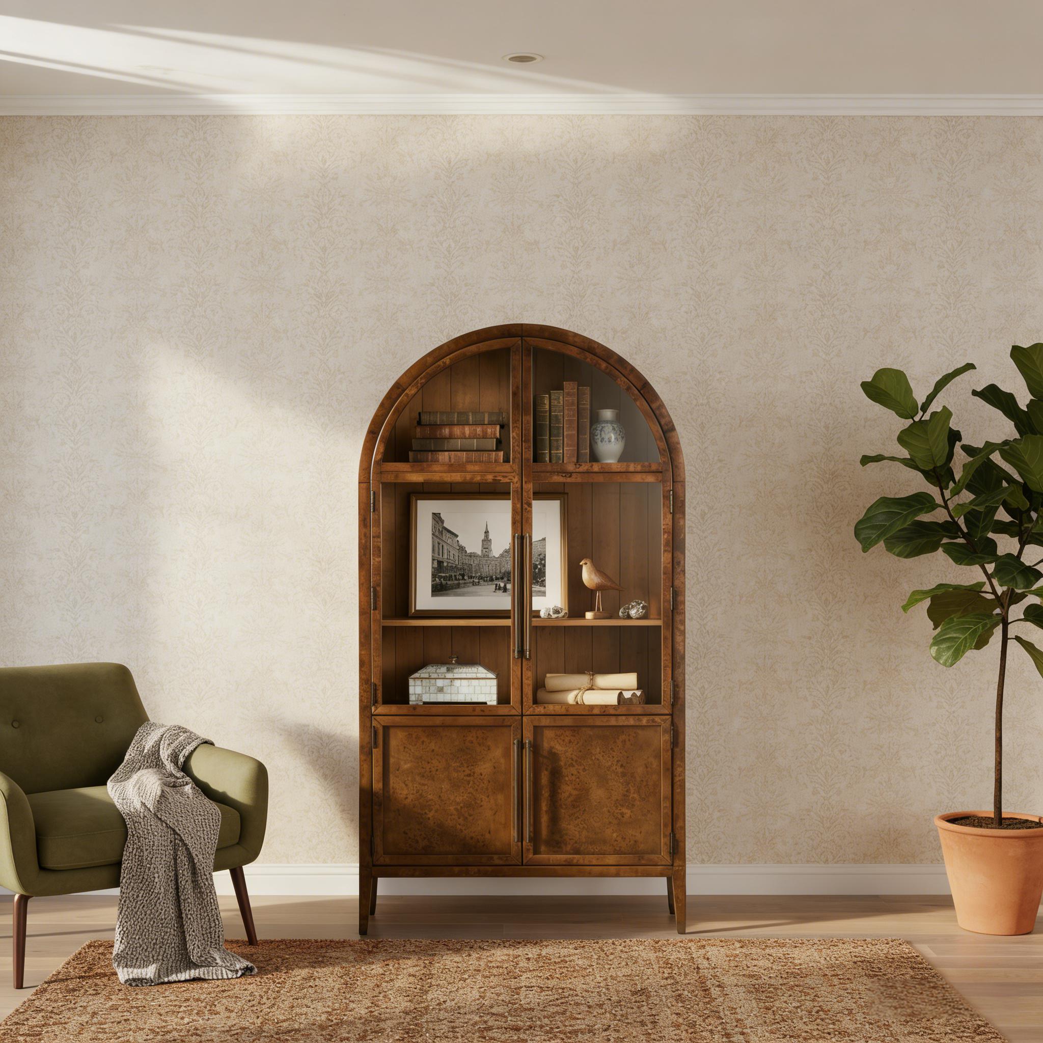 Infuse your space with timeless wood grain, where storage meets artistry for your beloved belongings. Crafted with warm, vintage-inspired burl wood and an elegant arched silhouette, this cabinet transforms your collection of essentials, cherished decor, and treasured keepsakes into a stunning focal point in your home. Let the rich, natural texture and thoughtful design turn every shelf into a curated display, blending functional organization with timeless mid-century charm, and turning your living space into a sanctuary of style and comfort.